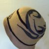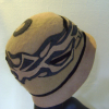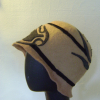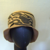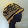 I had a decoration from another hat which I stitched onto this one. I cut away the hat under the decorative swirl, then stitched that on top, and so on, creting multiple layers.Some velveteen trim from yeat another vintage hat added some necessary black.