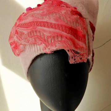 Refashioned vintage hat created from crocheted stretchy ribbon, with big yellow flower