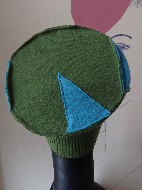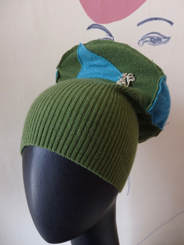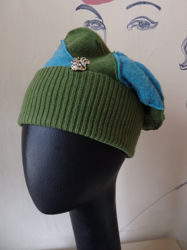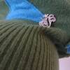 Pea green cashmere with turquoise accents. Wear it high, wear it cuffed, with the wire, or without, but always with the cute lil' squirrel!