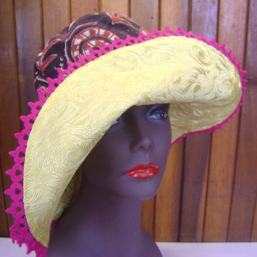The melding of 2 hats. Top part is hand dyed raffia, brim is from a fallen apart straw hat. Coupla PomPoms and some tulle round it out!