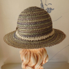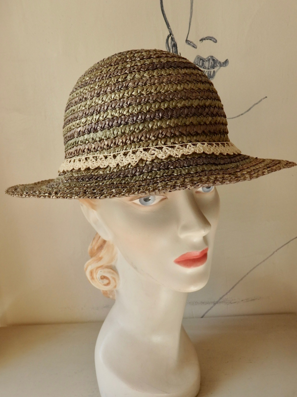 Vintage straw hat in muted greens and purples with added vintage trim and button