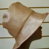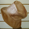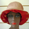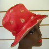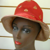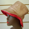 Shiny, mauve (?) leather hat, lined with shiny red and gold Bees!