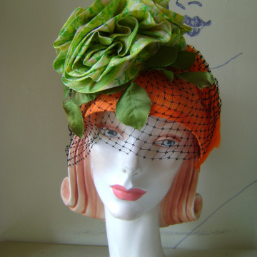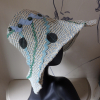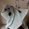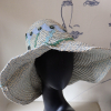 A pale blue refashioned paper/straw sunhat with vintage trims.