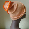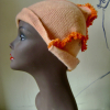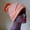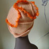 An assymmetric pale orange hat with bright orange fringe snaking its way up!