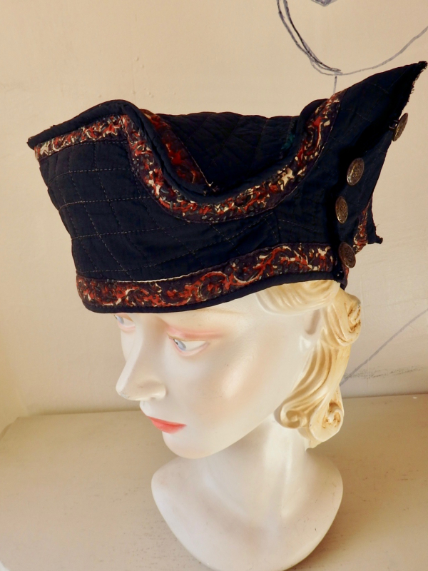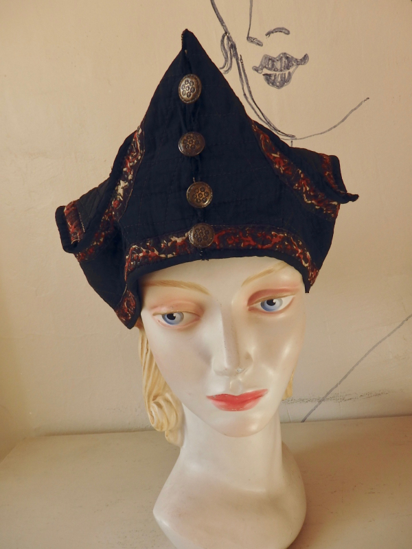 `This was a yoke from an old hippie dress. Quilted black cotton, folded in on itself, adorned with a row of brass buttons.