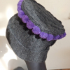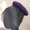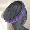 Cozy simple gray cable knit upcycled hat with a ring of purple PomPoms!