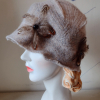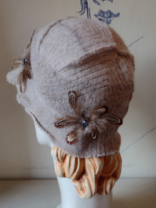 A coupla feather flowers complete this cloche-like hat