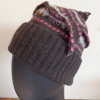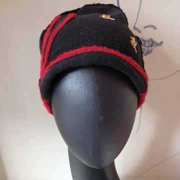 A cap pinched together with some vintage buttons rhat look like nuts, as in nuts and bolts.