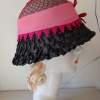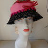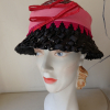 Black Raffia brim, topped with silver (covered in red netting) and a pink vintage hat band all add up to this hat with trim vintage trim and bows