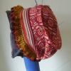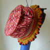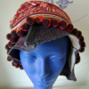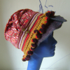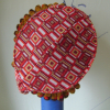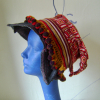 A vintage coat collar attached to lightweight groovy patterned wool, topped off with a wire and embellished with vintage pompom trim.
